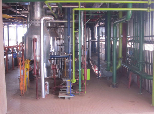 As stated earlier, hexane after extraction of oil is called ‘miscella’ ( mixture of oil + hexane). In distillation section the miscella is separated. The distillation is carried under vacuum to protect oil color and bleachability. The distillation under vacuum reduces the boiling point of hexane. Since the distillation is done at lower temperature, the steam consumption to heat miscella is reduced. The distillation unit consists of one Economizer with separator, one Heater with separator and one set of stripping column ( 3 piece design). In the 1st Economizer miscella is heated up to 55-600C and sent to separator. Here a low quantity of solvent from miscella is evaporated (40%). There after in the heater the miscella is heated to 75-850C and sent to the separator. Here most of the quantity of solvent from miscella is evaporated (97%). Finally in the stripping column the last traces of hexane from oil is removed in the support with high vacuum along with low temperature. Now the final oil from stripping column is collected by vacuum cooler and after cooling down the temperature of the final oil and it is sent to semi storage tank and from there to Bulk oil storage tank.